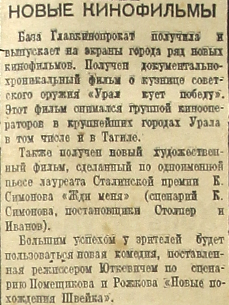 База Главкинопрокат получила и выпускает на экраны города ряд новых кинофильмов. Получен документально-хроникальный фильм о кузнице советского оружия «Урал кует победу». Этот фильм снимался группой кинооператоров в крупнейших городах Урала в том числе и в Тагиле.