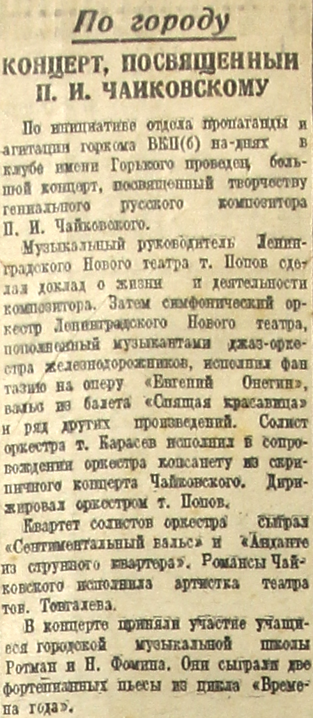 По инициативе отдела пропаганды и агитации горкома ВКП(б) на-днях в клубе имени Горького проведен большой концерт, посвященный творчеству гениального русского композитора П. И. Чайковского.