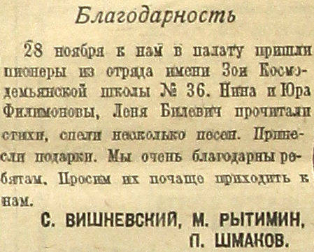 3 ноября к нам в палату пришли пионеры из отряда имени Зои Космодемьянской школы № 36. Нина и Юра Филимоновы, Леня Билевич прочитали стихи, спели несколько песен. Принесли подарки. Мы очень благодарны ребятам. Просим их почаще приходить к нам.