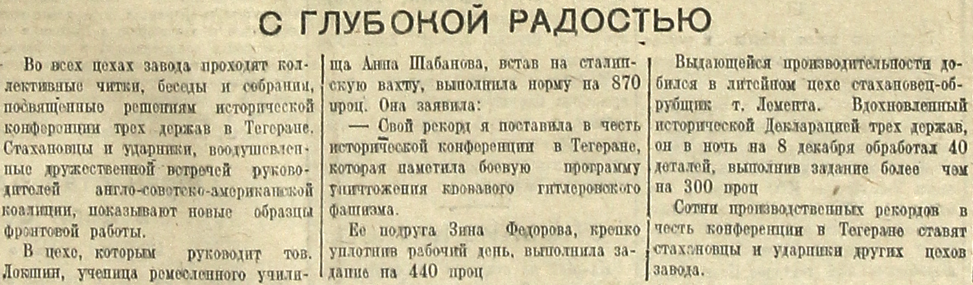 Во всех цехах завода проходят коллективные читки, беседы и собрания, посвященные решениям исторической конференции трех держав в Тегеране. Стахановцы и ударники, воодушевленные дружественной встречей руководителей англо-советско-американской коалиции, показывают новые образцы фронтовой работы.