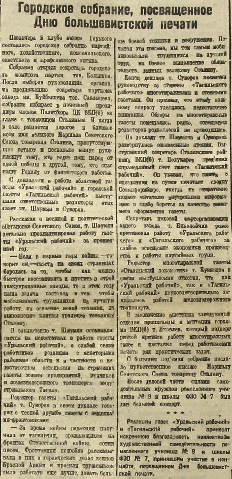 По докладу тт. Шаумяна и Сурова развернулась оживленные прения. Выступающий секретарь Сталинского района ВКП(б) т. Полукаров предъявил справедливый счет газете «Тагильский рабочий». Он указал, что газета с опозданием на сутки печатает сводку Совинформбюро, иногда не оперативно подает читателю внутреннюю информацию и слабо борется за качество внешнего оформления газеты.