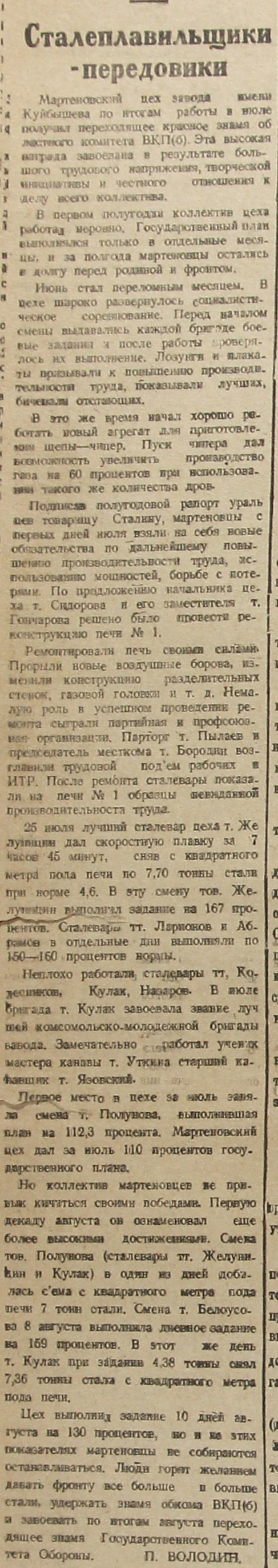Цех выполнил задание 10 дней августа на 130 процентов, но и на этих показателях мартеновцы не собираются останавливаться. Люди горят желанием давать фронту все больше и больше стали, удержать знамя обкома ВКП(б) и завоевать по итогам августа переходящее знамя Государственного Комитета Обороны.
