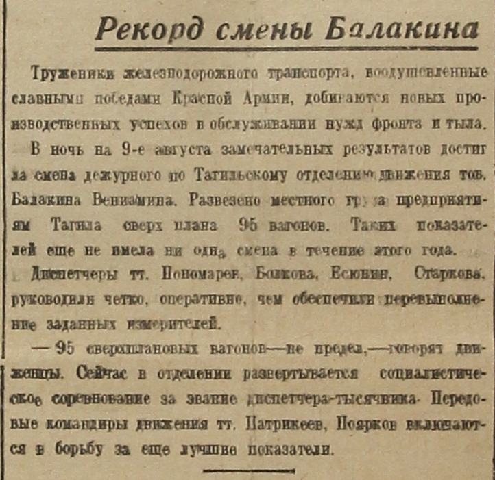 В ночь на 9-е августа замечательных результатов достигла смена дежурного по Тагильскому отделению движения тов. Балакина Вениамина. Развезено местного груза предприятиям Тагила сверх плана 95 вагонов. Таких показателей еще не имела ни одна смена в течение этого года.
