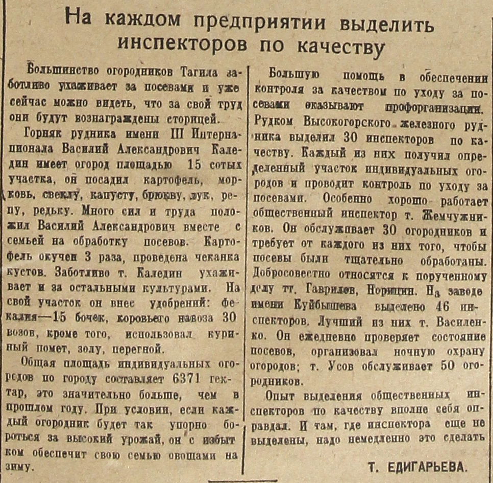 Большую помощь в обеспечении контроля за качеством по уходу за посевами оказывают профорганизации. Рудком Высокогорского железного рудника выделил 30 инспекторов по качеству. Каждый из них получил определенный участок индивидуальных огородов и проводит контроль по уходу за посевами. Особенно хорошо работает общественный инспектор т. Жемчужников. Он обслуживает 30 огородников и требует от каждого из них того, чтобы посевы были тщательно обработаны. Добросовестно относятся к порученному делу тт. Гаврилов, Норицин. На заводе имени Куйбышева выделено 46 инспекторов. Лучший из них т. Василенко. Он ежедневно проверяет состояние посевов, организовал ночную охрану огородов; т. Усов обслуживает 50 огородников.