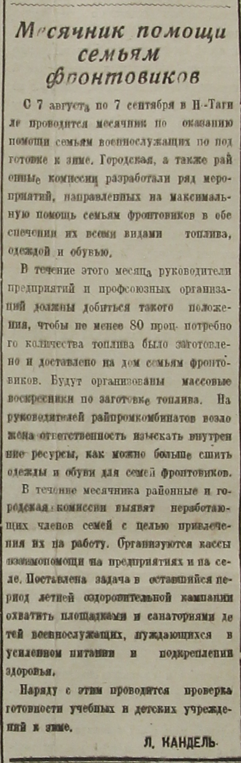 В течение этого месяца руководители предприятий и профсоюзных организаций должны добиться такого положения, чтобы не менее 80 проц. потребного количества топлива было заготовлено и доставлено на дом семьям фронтовиков. Будут организованы массовые воскресники по заготовке топлива. На руководителей райпромкомбинатов возложена ответственность взыскать внутренние ресурсы, как можно больше сшить одежды и обуви для семей фронтовиков.