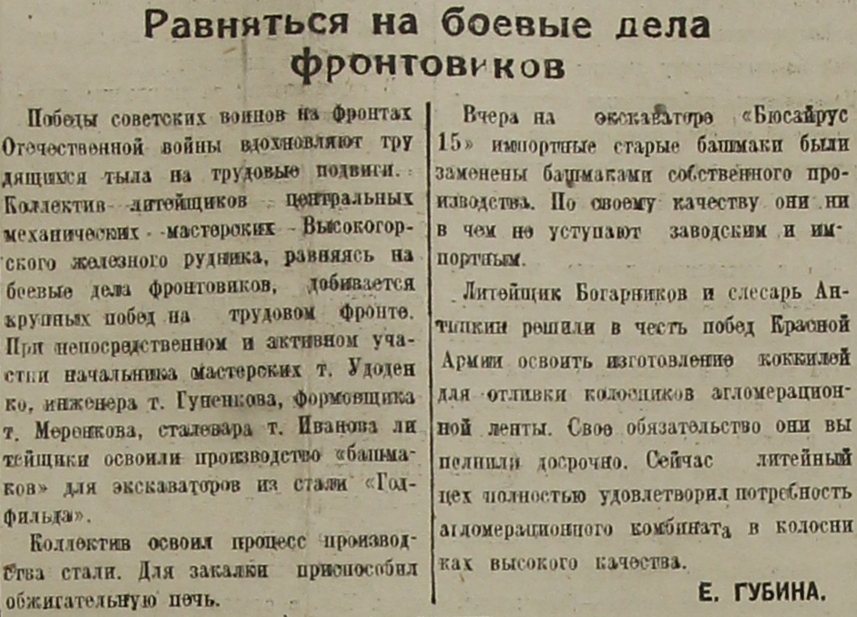 Победы советских воинов на фронтах Отечественной войны вдохновляют трудящихся тыла на трудовые подвиги. Коллектив литейщиков центральных механических мастерских Высокогорского железного рудника, равняясь на боевые дела фронтовиков, добивается крупных побед на трудовом фронте. При непосредственном и активном участии начальника мастерских т. Удоденко, инженера т. Гуненкова, формовщика т. Меренкова, сталевара т. Иванова литейщики освоили производство «башмаков» для экскаваторов из стали «Годфильда».