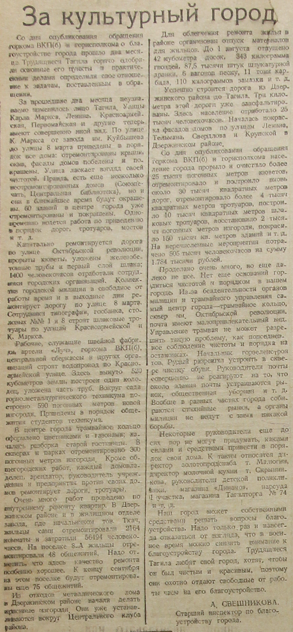 За пошедшие два месяца неузнаваемо изменилось лицо Тагила. Улицы Карла Маркса, Ленина, Красноармейская, Первомайская и другие теперь имеют совершенно иной вид. По улице К. Маркса от завода им. Куйбышева до улицы 8 марта приведены в порядок все дома: отремонтированы крыши, окна, фасады домов побелены и покрашены. Улица ласкает взгляд своей чистотой. Правда, есть еще несколько неотремонтированных домов (Союзпечать, Центральная библиотека), они в ближайшее время будут окрашены. 60 зданий в центре города уже отремонтированы и покрашены. Одновременно ведется работа по приведению в порядок дорог, тротуаров, мостов и т.д.
