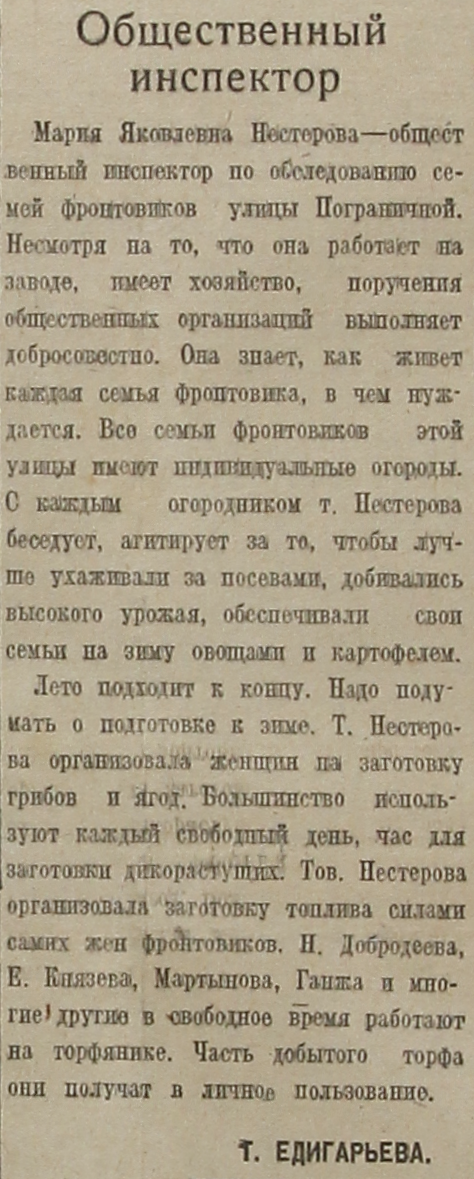 Мария Яковлевна Нестерова – общественный инспектор по обследованию семей фронтовиков улицы Пограничной. Несмотря на то, что она работает на заводе, имеет хозяйство, поручения общественных организаций выполняет добросовестно. Она знает, как живет каждая семья фронтовика, в чем нуждается. Все семьи фронтовиков этой улицы имеют индивидуальные огороды. С каждым огородником т. Нестерова беседует, агитирует за то, чтобы лучше ухаживали за посевами, добивались высокого урожая, обеспечивали свои семьи на зиму овощами и картофелем.