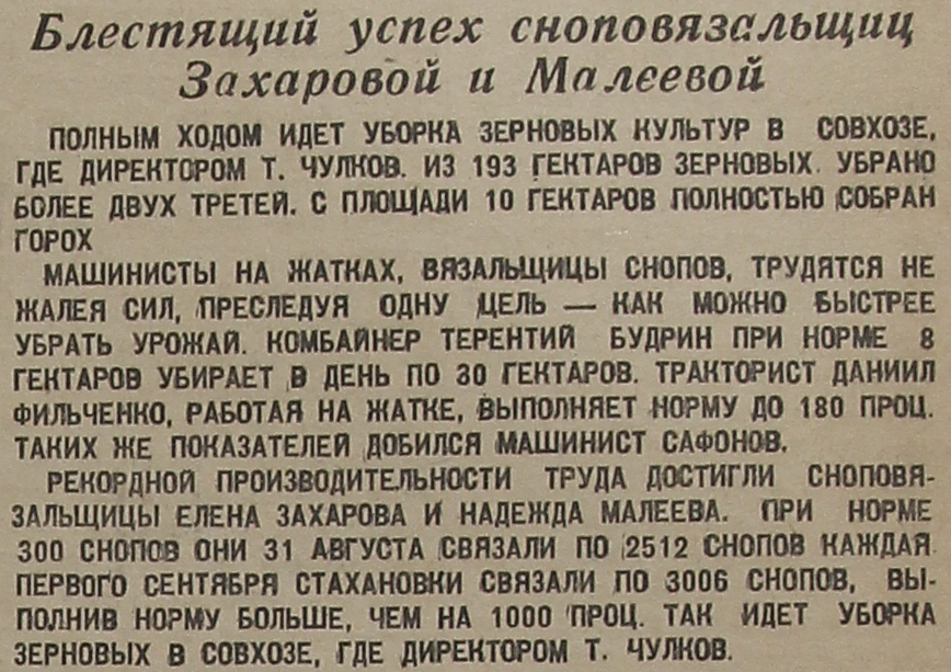 Рекордной производительности труда достигли сноповязальщицы Елена Захарова и Надежда Малеева. При норме 300 снопов они 31 августа связали по 2512 снопов каждая. Первого сентября стахановки связали по 3006 снопов, выполнив норму больше, чем на 1000 проц. Так идет уборка зерновых в совхозе, где директором т. Чулков.