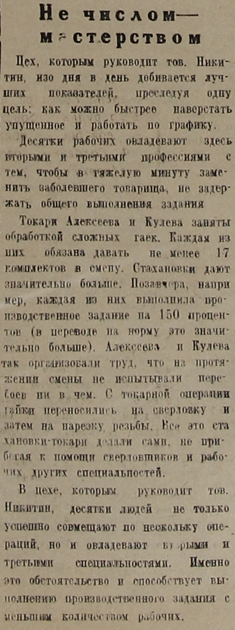 В цехе, которым руководит тов. Никитин, десятки людей не только успешно совмещают по нескольку операций, но и овладевают вторыми и третьими специальностями. Именно это обстоятельство и способствует выполнению производственного задания с меньшим количеством рабочих.