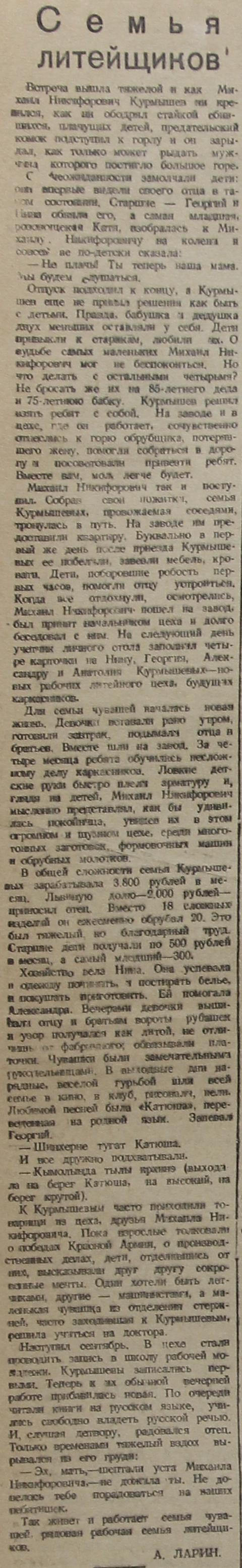 В общей сложности семья Курмышевых зарабатывала 3.800 рублей в месяц. Львиную долю – 2.000 рублей – приносил отец. Вместо 18 сложных изделий он ежесменно обрубал 20. Это был тяжелый, но благодарный труд. Старшие дети получали по 500 рублей в месяц, а самый младший – 300.