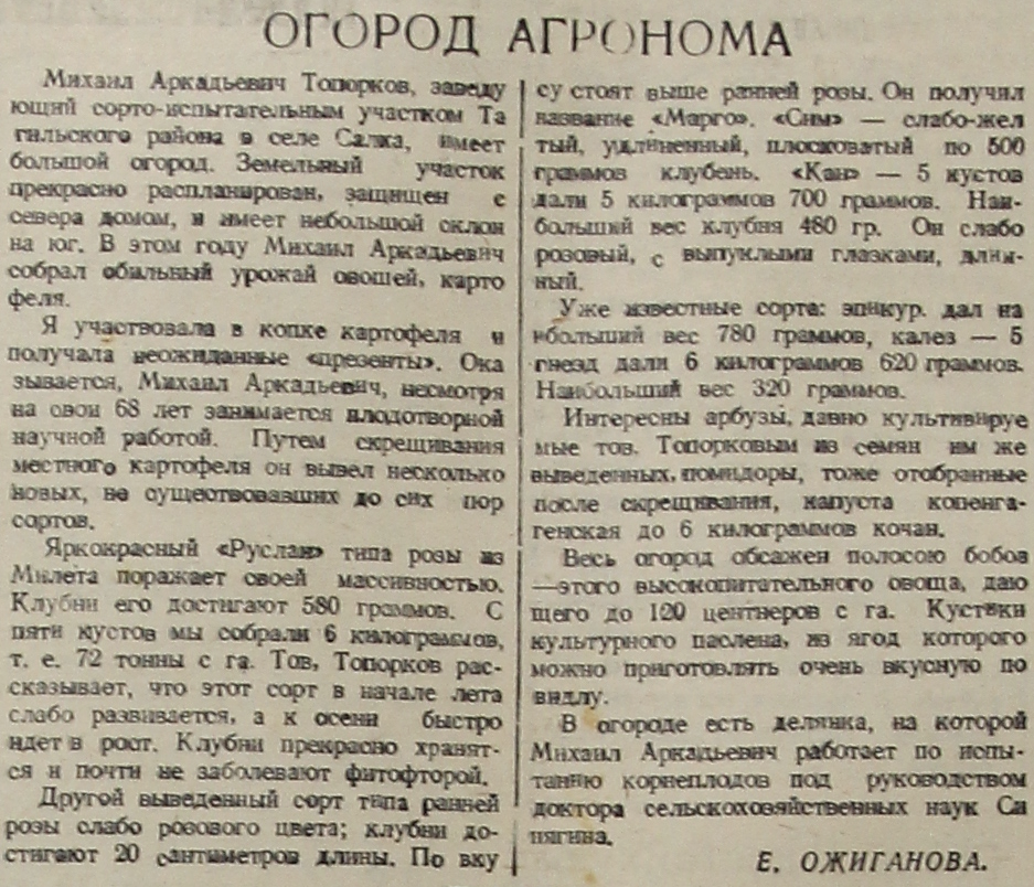 Михаил Аркадьевич Топорков, заведующий сорто-испытательным участком Тагильского района в селе Салка, имеет большой огород. Земельный участок прекрасно распланирован, защищен с севера домом, и имеет небольшой склон на юг. В этом году Михаил Аркадьевич собрал обильный урожай овощей, картофеля.