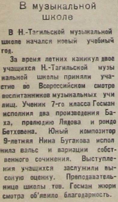 За время летних каникул двое учащихся Н.-Тагильской музыкальной школы приняли участие во Всероссийском смотре воспитанников музыкальных училищ. Ученик 7-го класса Госман исполнил два произведения Баха, прелюдию Лядова и рондо Бетховена. Юный композитор 9-летняя Нина Бугакова исполнила вальс и вариации собственного сочинения. Выступления учащихся заслужили высокую оценку. Преподавательнице школы тов. Госман жюри смотра объявило благодарность.