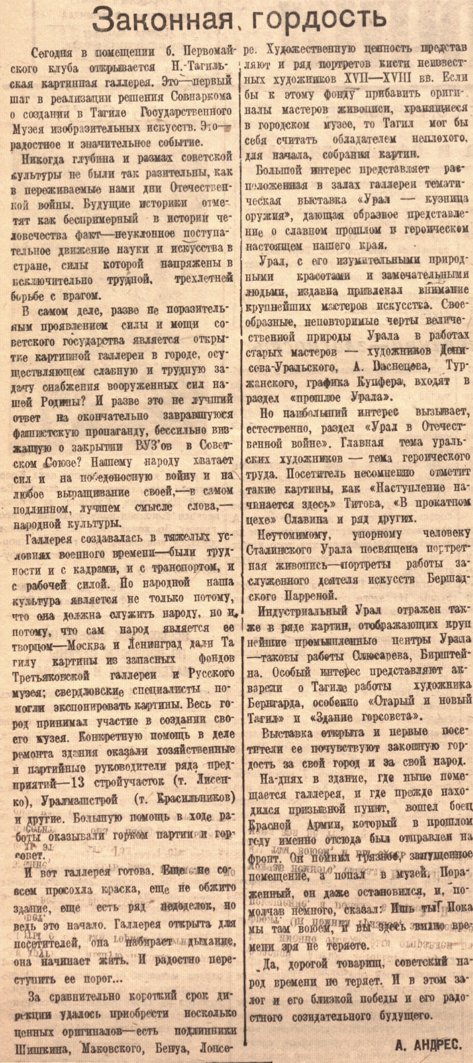 В самом деле, разве не поразительным проявлением силы и мощи советского государства является открытие картинной галлереи в городе, осуществляющем славную и трудную задачу снабжения вооруженных сил нашей Родины? И разве это не лучший ответ на окончательно завравшуюся фашистскую пропаганду, бессильно визжащую о закрытии ВУЗ'ов в Советском Союзе? Нашему народу хватает сил и на победоносную войну и на любое выращивание своей, – в самом подлинном, лучшем смысле слова, – народной культуры.