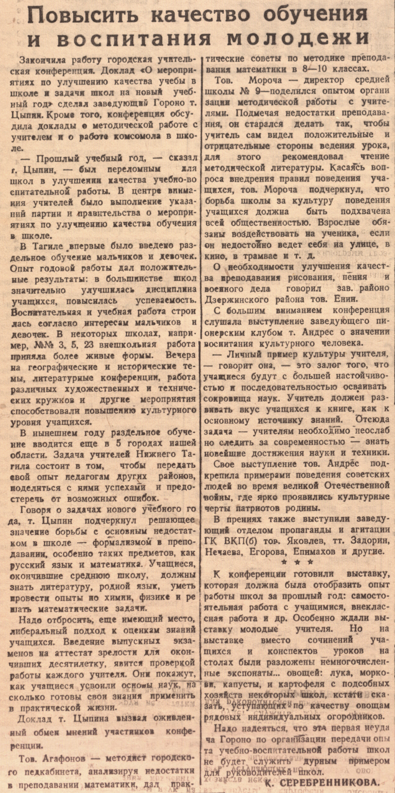 В Тагиле впервые было введено раздельное обучение мальчиков и девочек. Опыт годовой работы дал положительные результаты: в большинстве школ значительно улучшилась дисциплина учащихся, повысилась успеваемость. Воспитательная и учебная работа строилась согласно интересам мальчиков и девочек. В некоторых школах, например, №№ 3, 5, 23 внешкольная работа приняла более живые формы. Вечера на географические и исторические темы, литературные конференции, работа различных художественных н технических кружков и другие мероприятия способствовали повышению культурного уровня учащихся.