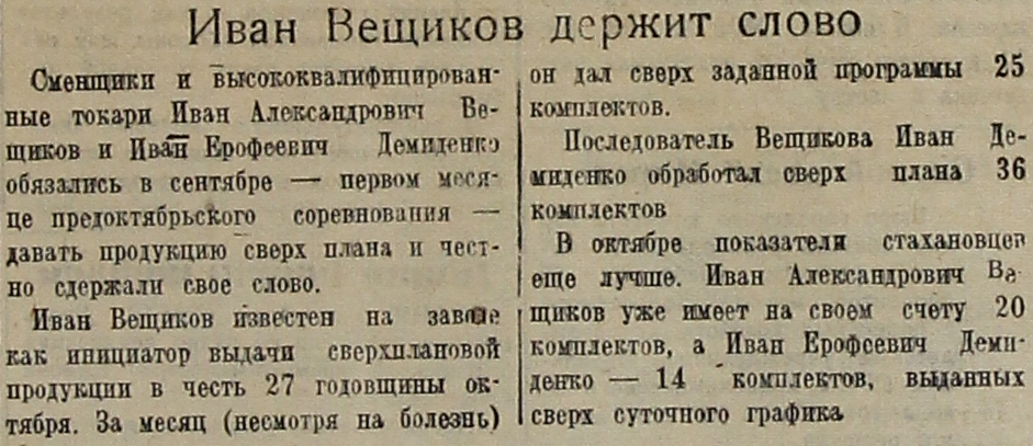 Иван Вещиков известен на заводе как инициатор выдачи сверхплановой продукции в честь 27 годовщины октября. За месяц (несмотря на болезнь) он дал сверх заданной программы 25 комплектов.