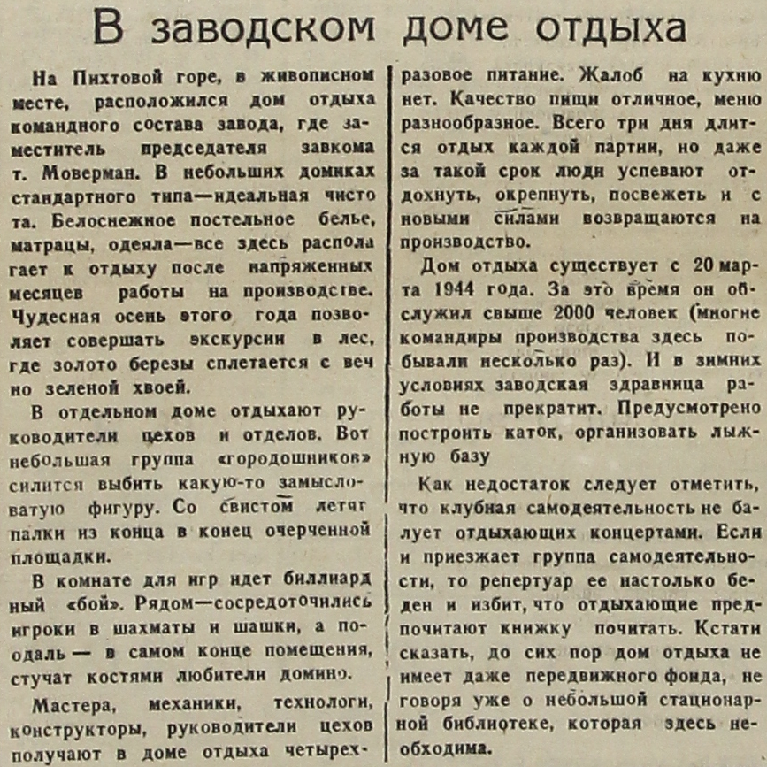 На Пихтовой горе, в живописном месте, расположился дом отдыха командного состава завода, где заместитель председателя завкома т. Моверман. В небольших домиках стандартного типа – идеальная чистота. Белоснежное постельное белье, матрацы, одеяла – все здесь располагает к отдыху после напряженных месяцев работы на производстве. Чудесная осень этого года позволяет совершать экскурсии в лес, где золото березы сплетается с вечно зеленой хвоей.