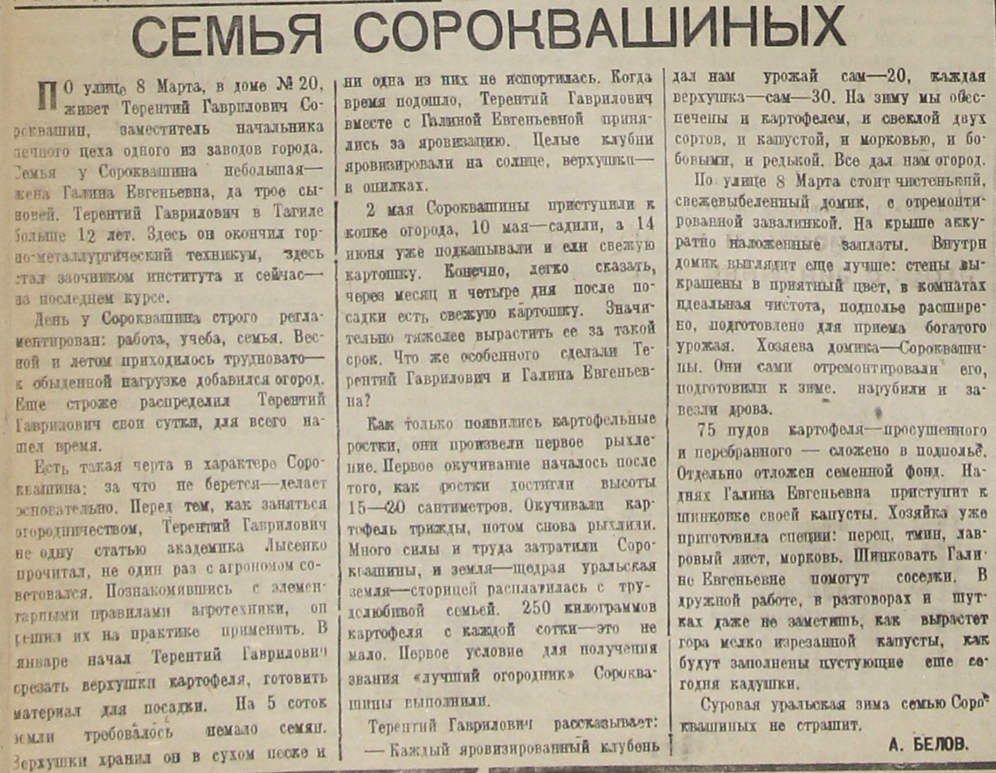 По улице 8 Марта, в доме 20, живет Терентий Гаврилович Сороквашин, заместитель начальника печного цеха одного из заводов города. Семья у Сороквашина небольшая – Галина Евгеньевна, да трое сыновей. Терентий Гаврилович в Тагиле больше 12 лет. Здесь он окончил горно-металлургический техникум, здесь стал заочником института и сейчас – на последнем курсе.