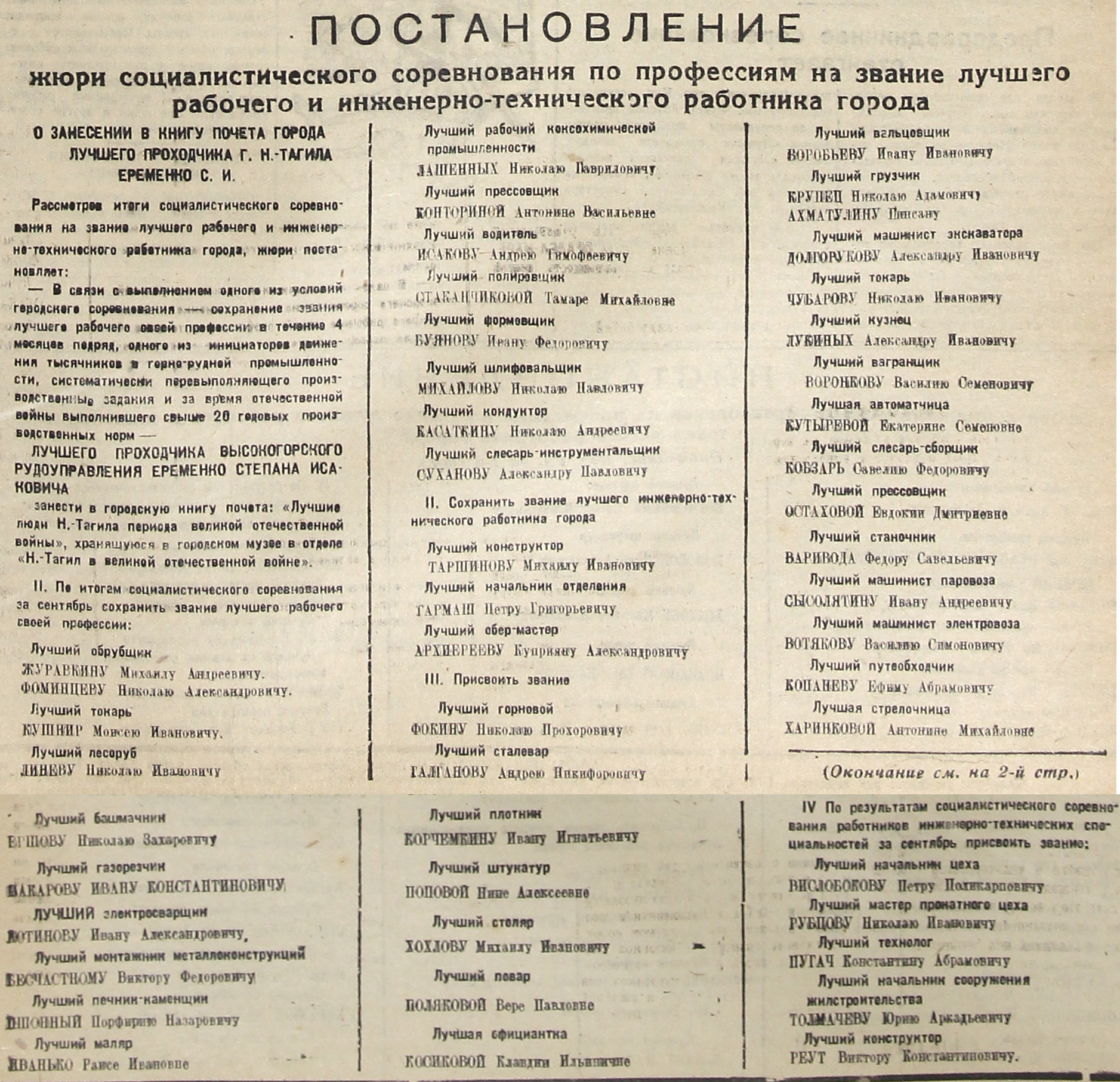 – В связи с выполнением одного из условий городского соревнования – сохранение звания лучшего рабочего своей профессии в течение 4 месяцев подряд, одного из инициаторов движения тысячников в горно-рудной промышленности, систематически перевыполняющего производственные задания и за время отечественной войны выполнившего свыше 20 годовых производственных норм –