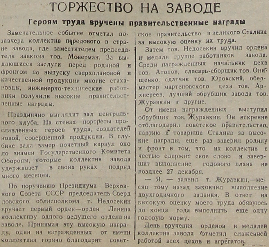 От имени награжденных выступил обрубщик тов. Журавкин. Он искренне отблагодарил советское правительство, партию и товарища Сталина за высокие награды, еще раз заверил родину и фронт в том, что их коллектив с честью сдержит свое слово и завершит выполнение годового плана не позднее 27 декабря.
