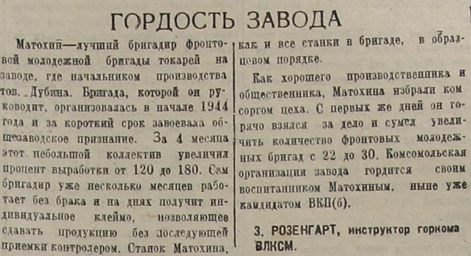Матохин – лучший бригадир фронтовой молодежной бригады токарей на заводе, где начальником производства тов. Дубина. Бригада, которой он руководит, организовалась в начале 1944 года и за короткий срок завоевала общезаводское признание. За 4 месяца этот небольшой коллектив увеличил процент выработки от 120 до 180. Сам бригадир уже несколько месяцев работает без брака и на днях получит индивидуальное клеймо, позволяющее сдавать продукцию без доследующей приемки контролером. Станок Матохина, как и все станки в бригаде, в образцовом порядке.