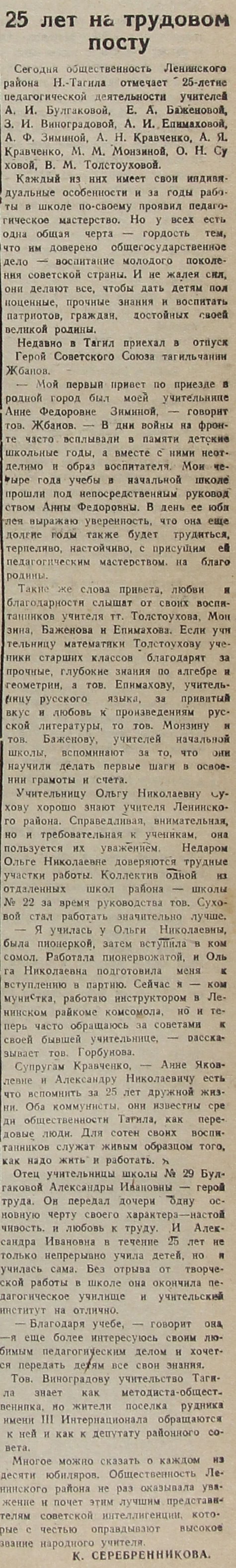 Сегодня общественность Ленинского района Н.-Тагила отмечает 25-летие педагогической деятельности учителей А. И. Булгаковой, Е. А. Баженовой, 3. И. Виноградовой, А. И. Епимаховой, А. Ф. Зиминой, А. Н. Кравченко, А. Я. Кравченко, М. М. Монзиной, О. Н. Суховой, В. М. Толстоуховой.