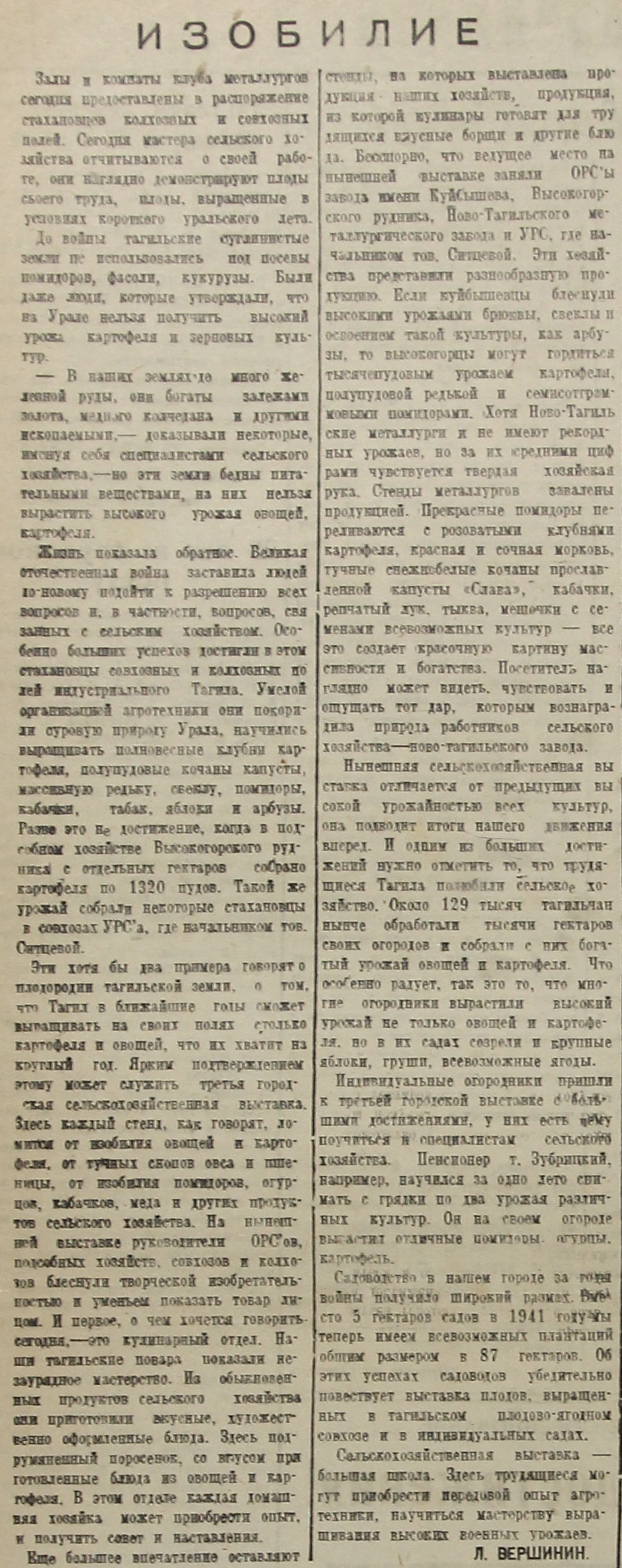 Жизнь показала обратное. Великая отечественная война заставила людей по-новому подойти к разрешению всех вопросов и, в частности, вопросов, связанных с сельским хозяйством. Особенно больших успехов достигли в этом стахановцы совхозных и колхозных полей индустриального Тагила. Умелой организацией агротехники они покорили суровую природу Урала, научились выращивать полновесные клубни картофеля, полупудовые кочаны капусты, массивную редьку, свеклу, помидоры, кабачки, табак, яблоки и арбузы. Разве это не достижение, когда в подсобном хозяйстве Высокогорского рудника с отдельных гектаров собрано картофеля по 1320 пудов. Такой же урожай собрали некоторые стахановцы в совхозах УРСа, где начальником тов. Ситцевой.