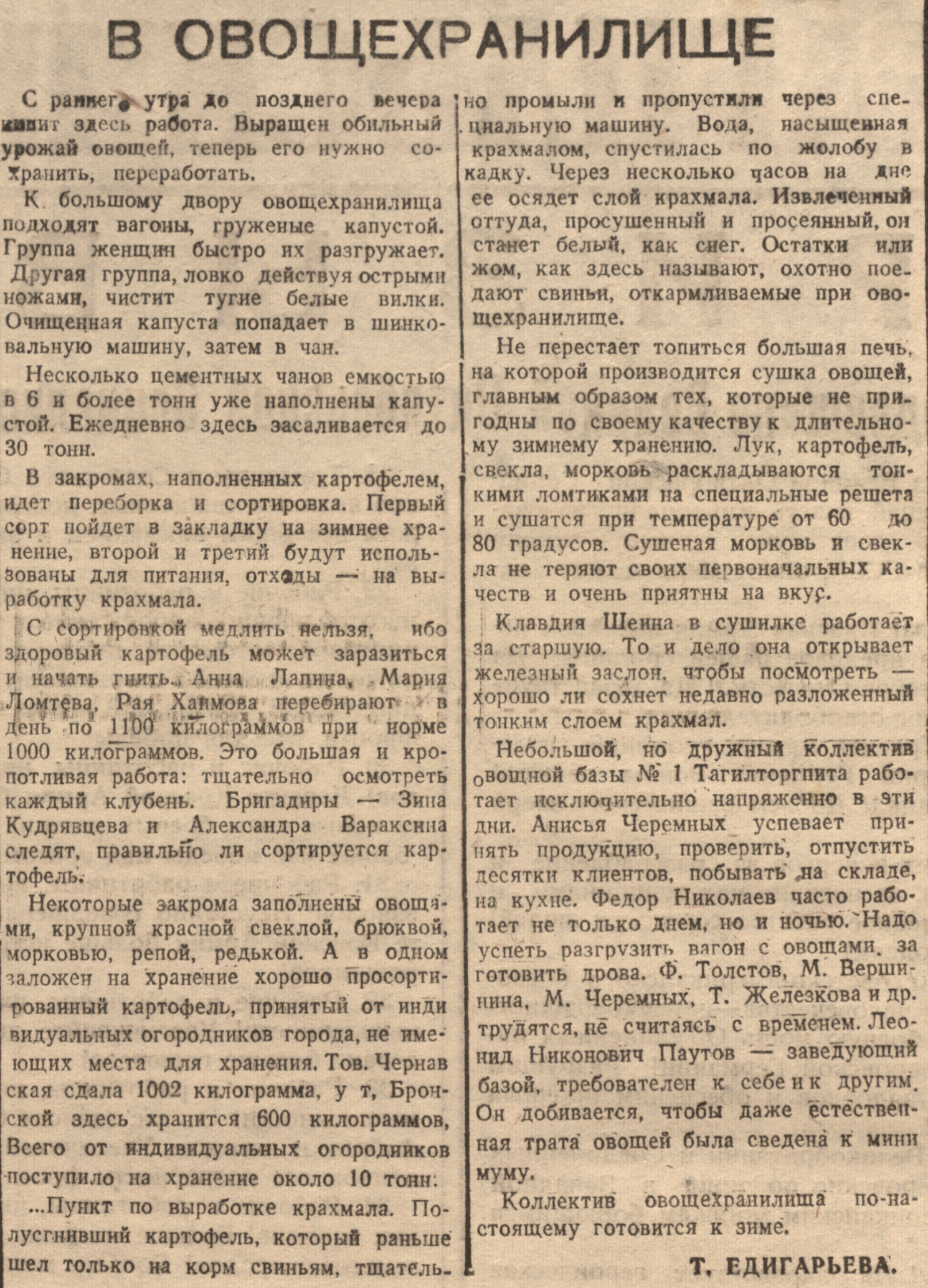 Небольшой, но дружный коллектив овощной базы № 1 Тагилторгпита работает исключительно напряженно в эти дни. Анисья Черемных успевает принять продукцию, проверить, отпустить десятки клиентов, побывать на складе, на кухне. Федор Николаев часто работает не только днем, но и ночью. Надо успеть разгрузить вагон с овощами, заготовить дрова. Ф. Толстов, М. Вершинина, М. Черемных, Т. Железкова и др. трудятся, не считаясь с временем. Леонид Никонович Паутов – заведующий базой, требователен к себе и к другим. Он добивается, чтобы даже естественная трата овощей была сведена к минимуму.