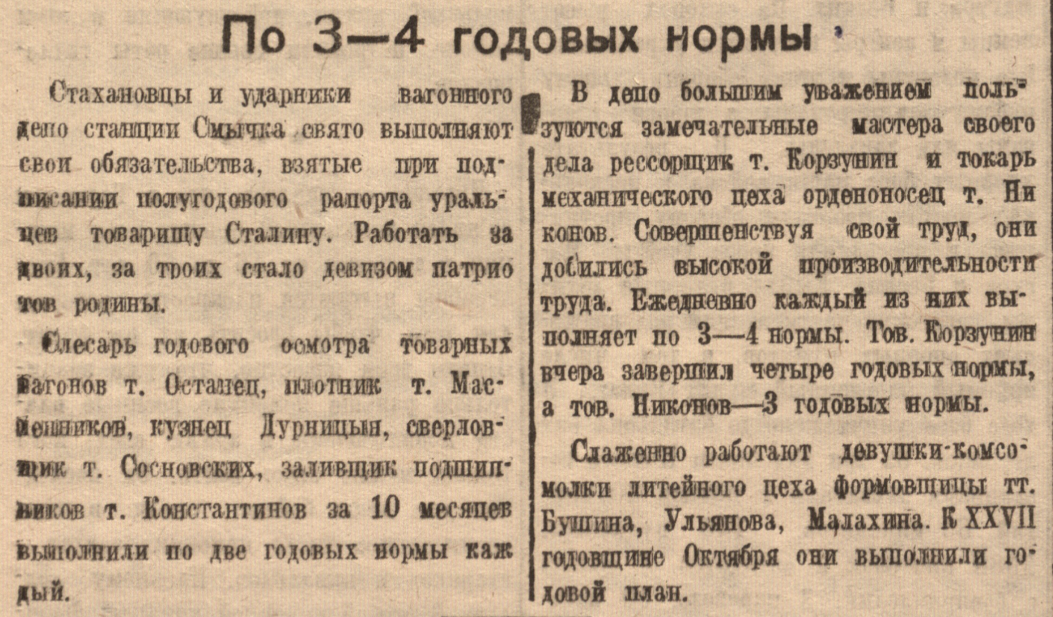 В депо большим уважением пользуются замечательные мастера своего дела рессорщик т. Корзунин и токарь механического цеха орденоносец т. Никонов. Совершенствуя свой труд, они добились высокой производительности труда. Ежедневно каждый из них выполняет по 3-4 нормы. Тов. Корзунин вчера завершил четыре годовых нормы, а тов. Никонов – 3 годовых нормы.