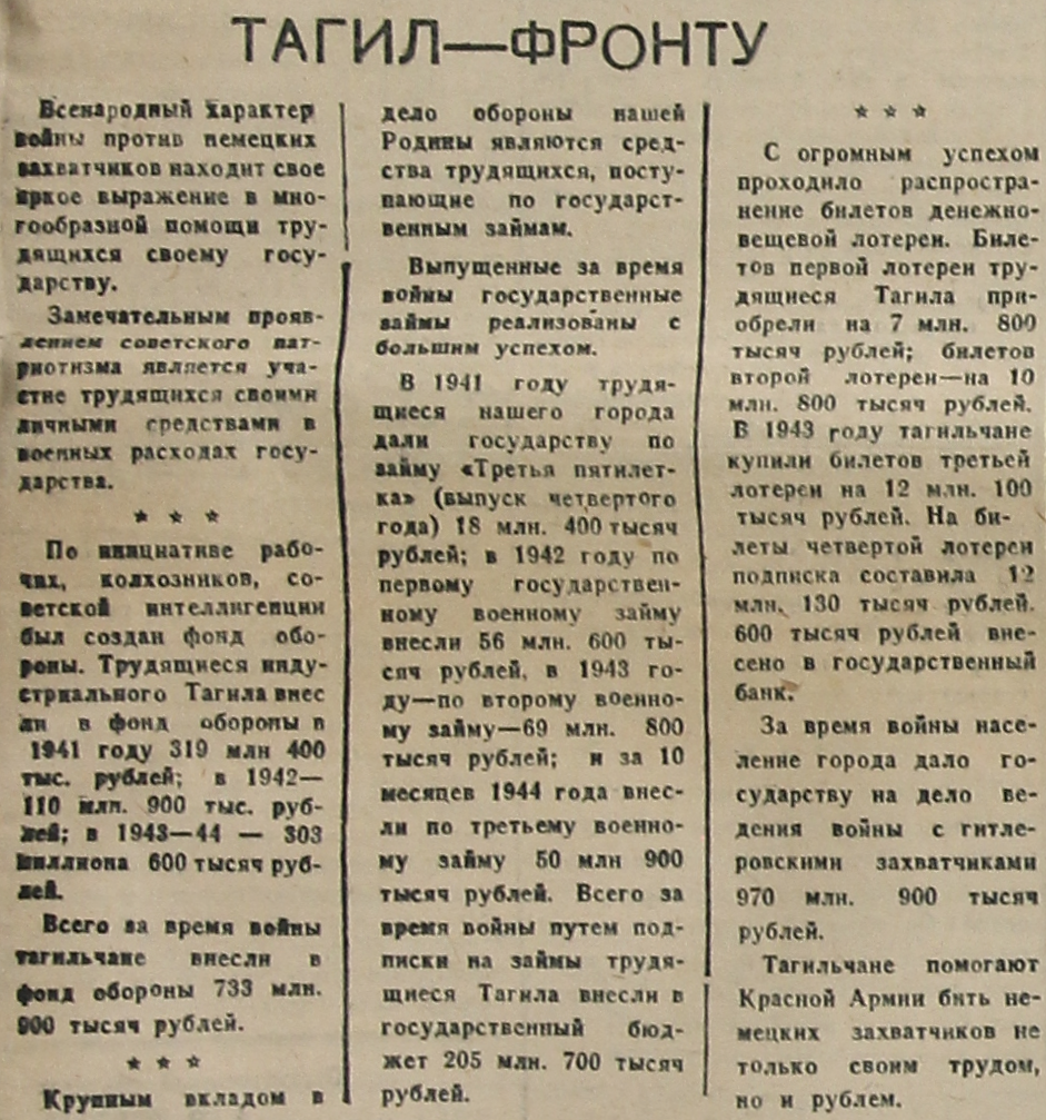 Крупным вкладом в дело обороны нашей Родины являются средства трудящихся, поступающие по государственным займам. Выпущенные за время войны государственные займы реализованы с большим успехом. В 1941 году трудящиеся нашего города дали государству по займу «Третья пятилетка» (выпуск четвертого года) 18 млн. 400 тысяч рублей; в 1942 году по первому государственному военному займу внесли 56 млн. 600 тысяч рублей, в 1943 году – по второму военному займу – 69 млн. 800 тысяч рублей; и за 10 месяцев 1944 года внесли по третьему военному займу 50 млн. 900 тысяч рублей. Всего за время войны путем подписки на займы трудящиеся Тагила внесли в государственный бюджет 205 млн. 700 тысяч рублей.