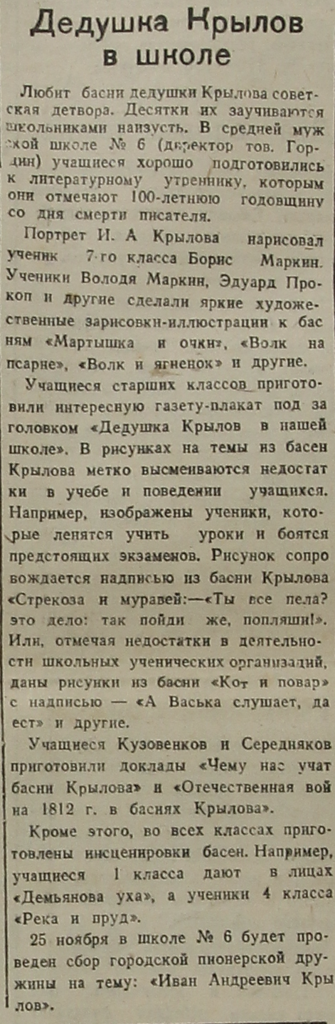 Любит басни дедушки Крылова советская детвора. Десятки их заучиваются школьниками наизусть. В средней мужской школе № 6 (директор тов. Гордин) учащиеся хорошо подготовились к литературному утреннику, которым они отмечают 100-летнюю годовщину со дня смерти писателя.