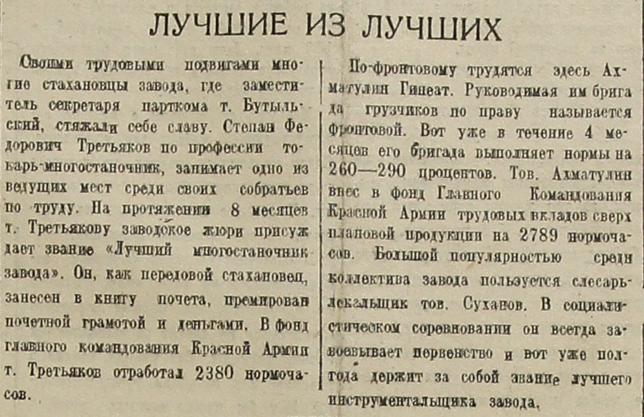 Своими трудовыми подвигами многие стахановцы завода, где заместитель секретаря парткома т. Бутыльский, стяжали себе славу. Степан Федорович Третьяков по профессии токарь-многостаночник, занимает одно из ведущих мест среди своих собратьев по труду. На протяжении 8 месяцев т. Третьякову заводское жюри присуждает звание «Лучший многостаночник завода». Он, как передовой стахановец, занесен в книгу почета, премирован почетной грамотой и деньгами. В фонд главного командования Красной Армии т. Третьяков отработал 2380 нормочасов.