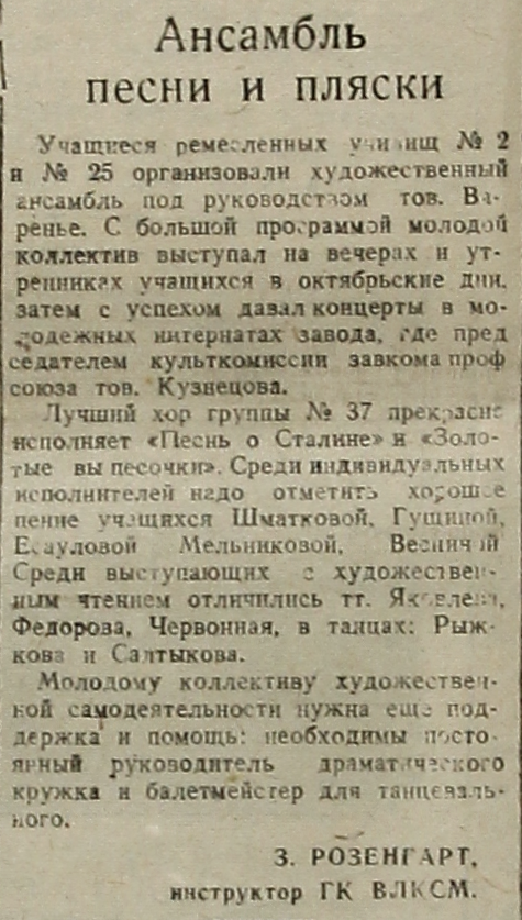 Учащиеся ремесленных училищ № 2 и № 25 организовали художественный ансамбль под руководством тов. Варенье. С большой программой молодой коллектив выступал на вечерах и утренниках учащихся в октябрьские дни, затем с успехом давал концерты в молодежных интернатах завода, где председателем культкомиссии завкома профсоюза тов. Кузнецов.