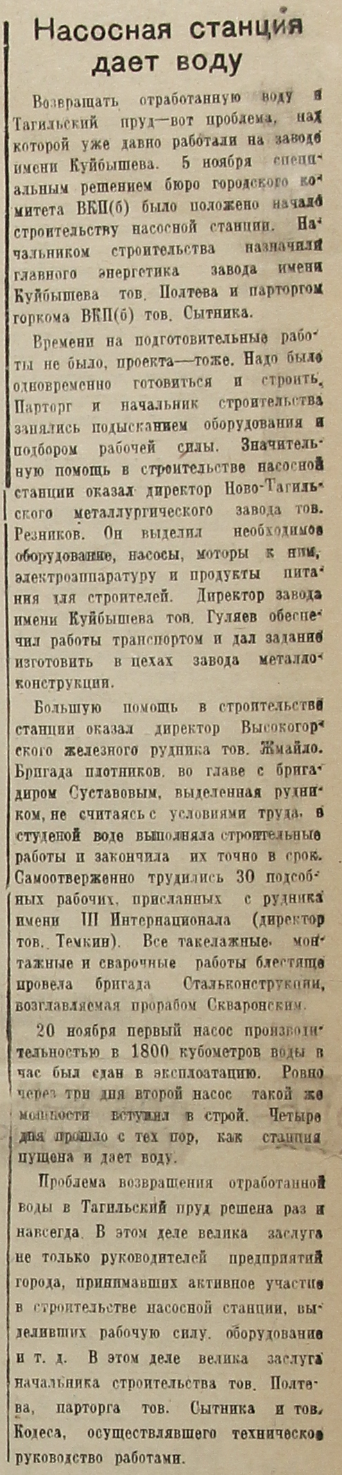 Возвращать отработанную воду в Тагильский пруд – вот проблема, над которой уже давно работают на заводе имени Куйбышева. 5 ноября специальным решением бюро городского комитета ВКП(б) было положено начало строительству насосной станции. Начальником строительства назначили главного энергетика завода имени Куйбышева тов. Полтева и парторгом горкома ВКП(б) тов. Сытника.
