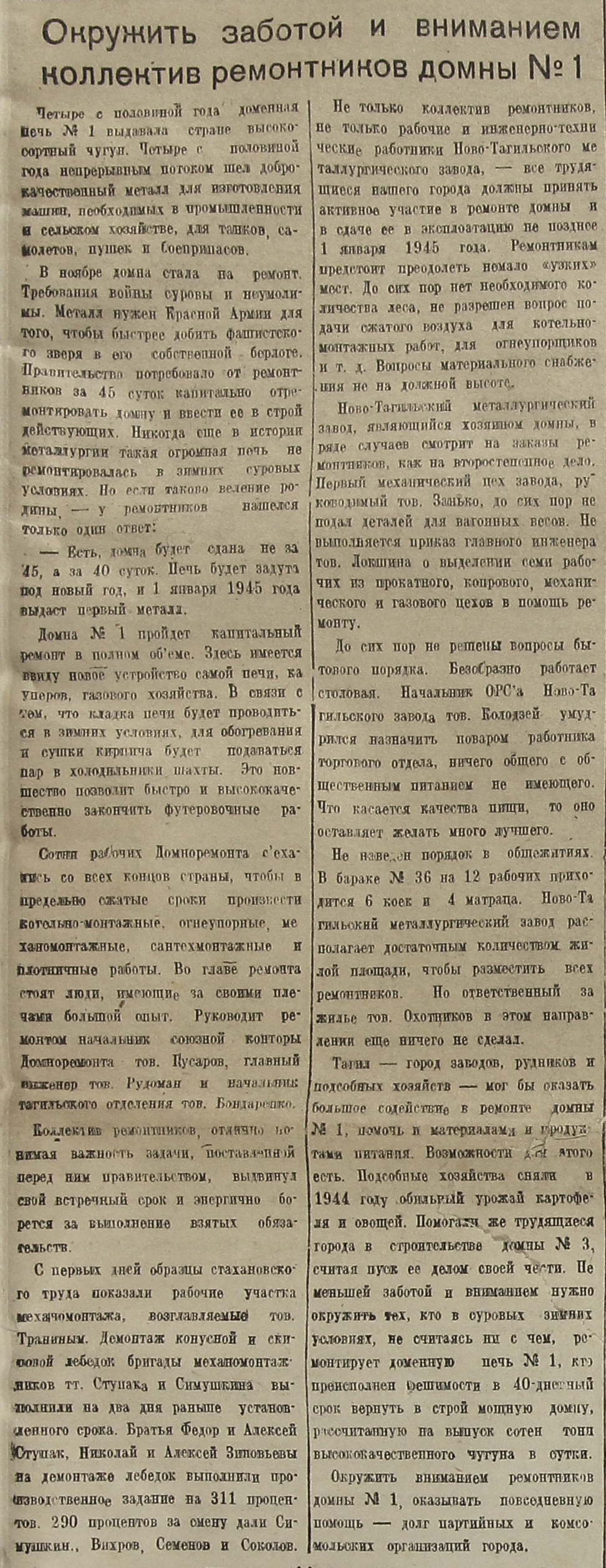 Тагил – город заводов, рудников и подсобных хозяйств – мог бы оказать большое содействие в ремонте домны № 1, помочь и материалами и продуктами питания. Возможности для этого есть. Подсобные хозяйства сняли в 1944 году обильный урожай картофеля и овощей. Помогали же трудящиеся города в строительстве домны № 3, считая пуск ее делом своей чести. Не меньшей заботой и вниманием нужно окружить тех, кто в суровых зимних условиях, не считаясь ни с чем, ремонтирует доменную печь № 1, кто преисполнен решимости в 40-дневный срок вернуть в строй мощную домну, рассчитанную на выпуск сотен тонн высококачественного чугуна в сутки.