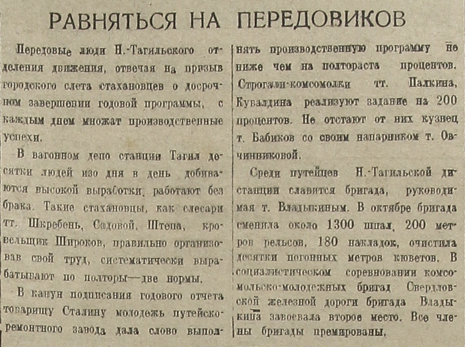 Среди путейцев Н.-Тагильской дистанции славится бригада, руководимая т. Владыкиным. В октябре бригада сменила около 1300 шпал, 200 метров рельсов, 180 накладок, очистила десятки погонных метров кюветов. В социалистическом соревновании комсомольско-молодежных бригад Свердловской железной дороги бригада Владыкина завоевала второе место. Все члены бригады премированы.
