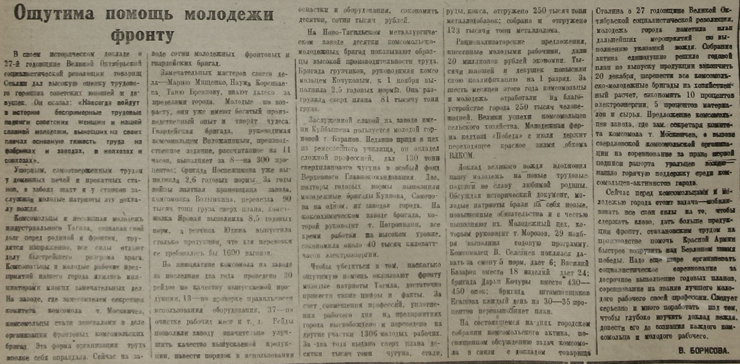 По инициативе комсомола на заводе за последние два года проведено 30 рейдов по качеству выпускаемой продукции, 13 – по проверке правильности использования оборудования, 37 – по очистке рабочих мест и т.д. Рейды позволили заводу значительно улучшить качество выпускаемой продукции, навести порядок в использовании оснастки и оборудования, сэкономить десятки, сотни тысяч рублей. На Ново-Тагильском металлургическом заводе десятки комсомольско-молодежных бригад показывают образцы высокой производительности труда. Бригада грузчиков, руководимая комсомольцем Кочуковым, к 1 ноября выполнила 2,5 годовых нормы. Она разгрузила сверх плана 81 тысячу тонн груза.