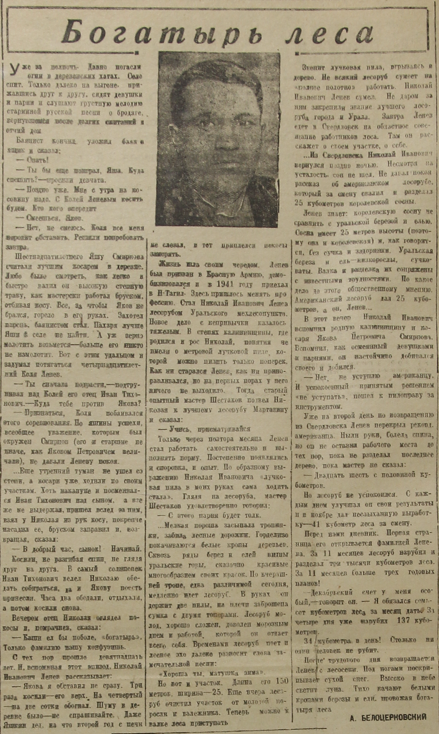 Жизнь шла своим чередом. Ленев был призван в Красную Армию, демобилизовался и в 1941 году приехал в Н-Тагил. Здесь пришлось менять профессию. Стал Николай Иванович Ленев лесорубом Уральского мехлесопункта. Новое дело с непривычки казалось тяжелым. В степях калининщины, где родился и рос Николай, понятия не имели о метровой лучковой пиле, которой можно пилить только поперек. Как ни старался Ленев, как ни приноравливался, но на первых порах у него ничего не выходило. Тогда старый опытный мастер Шестаков подвел Николая к лучшему лесорубу Мартазину и сказал: