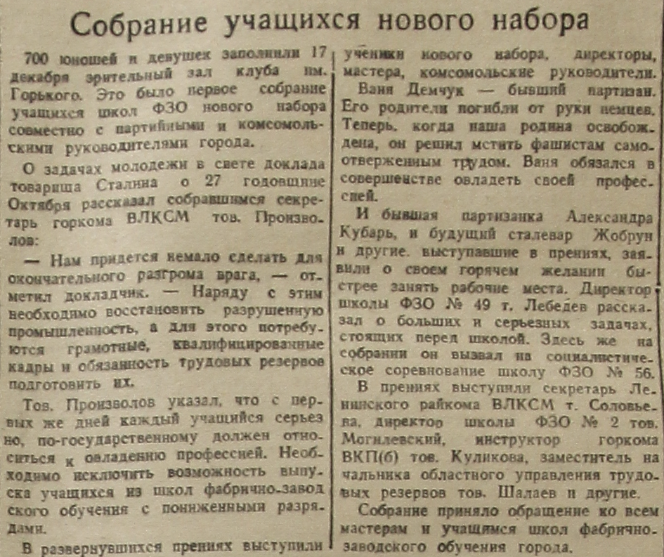 И бывшая партизанка Александра Кубарь, и будущий сталевар Жобрун и другие, выступавшие в прениях, заявили о своем горячем желании быстрее занять рабочие места. Директор школы ФЗО № 49 т. Лебедев рассказал о больших и серьезных задачах, стоящих перед школой. Здесь же на собрании он вызвал на социалистическое соревнование школу ФЗО № 56.