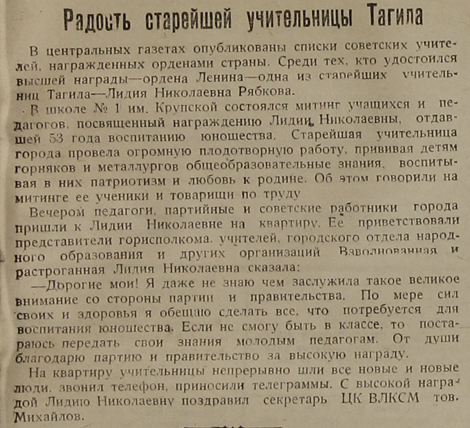 В центральных газетах опубликованы списки советских учителей, награжденных орденами страны. Среди тех, кто удостоился высшей награды – ордена Ленина – одна из старейших учительниц Тагила – Лидия Николаевна Рябкова.