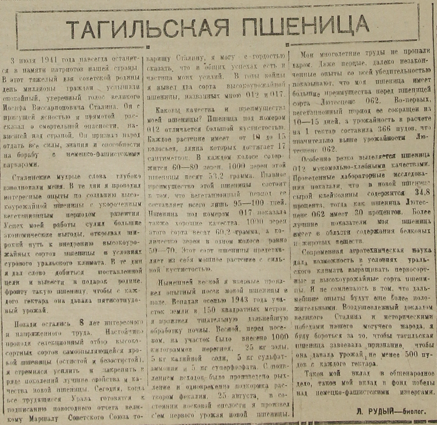 Современная агротехническая наука дала возможность в условиях уральского климата выращивать первосортные и высокоурожайные сорта пшеницы. Я не сомневаюсь в том, что дальнейшие опыты будут еще более положительными. Воодушевленный докладом великого Сталина и историческими победами нашего могучего народа, я буду бороться за то, чтобы тагильская пшеница завоевала признание, чтобы она давала урожай, не менее 500 пудов с каждого гектара.