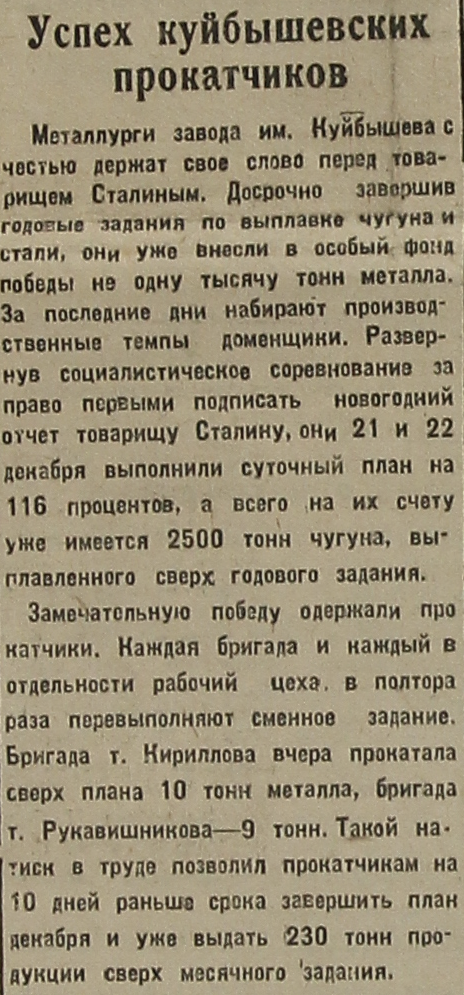 Металлурги завода им. Куйбышева с честью держат свое слово перед товарищем Сталиным. Досрочно завершив годовые задания по выплавке чугуна и стали, они уже внесли в особый фонд победы не одну тысячу тонн металла. За последние дни набирают производственные темпы доменщики. Развернув социалистическое соревнование за право первыми подписать новогодний отчет товарищу Сталину, они 21 и 22 декабря выполнили суточный план на 116 процентов, а всего на их счету уже имеется 2500 тонн чугуна, выплавленного сверх годового задания.