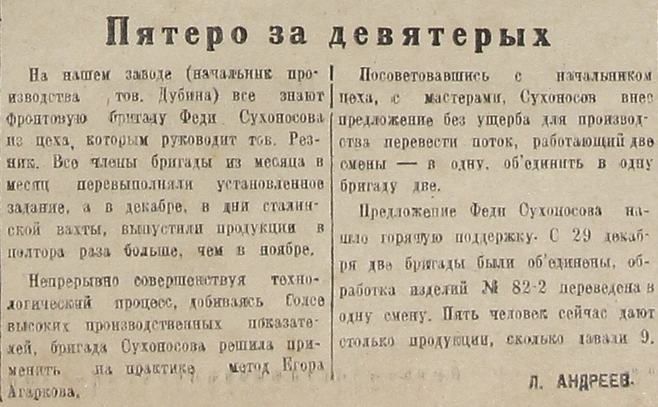 На нашем заводе (начальник производства тов. Дубина) все знают фронтовую бригаду Феди Сухоносова из цеха, которым руководит тов. Резник. Все члены бригады из месяца в месяц перевыполняли установленное задание, а в декабре, в дни сталинской вахты, выпустили продукции в полтора раза больше, чем в ноябре.