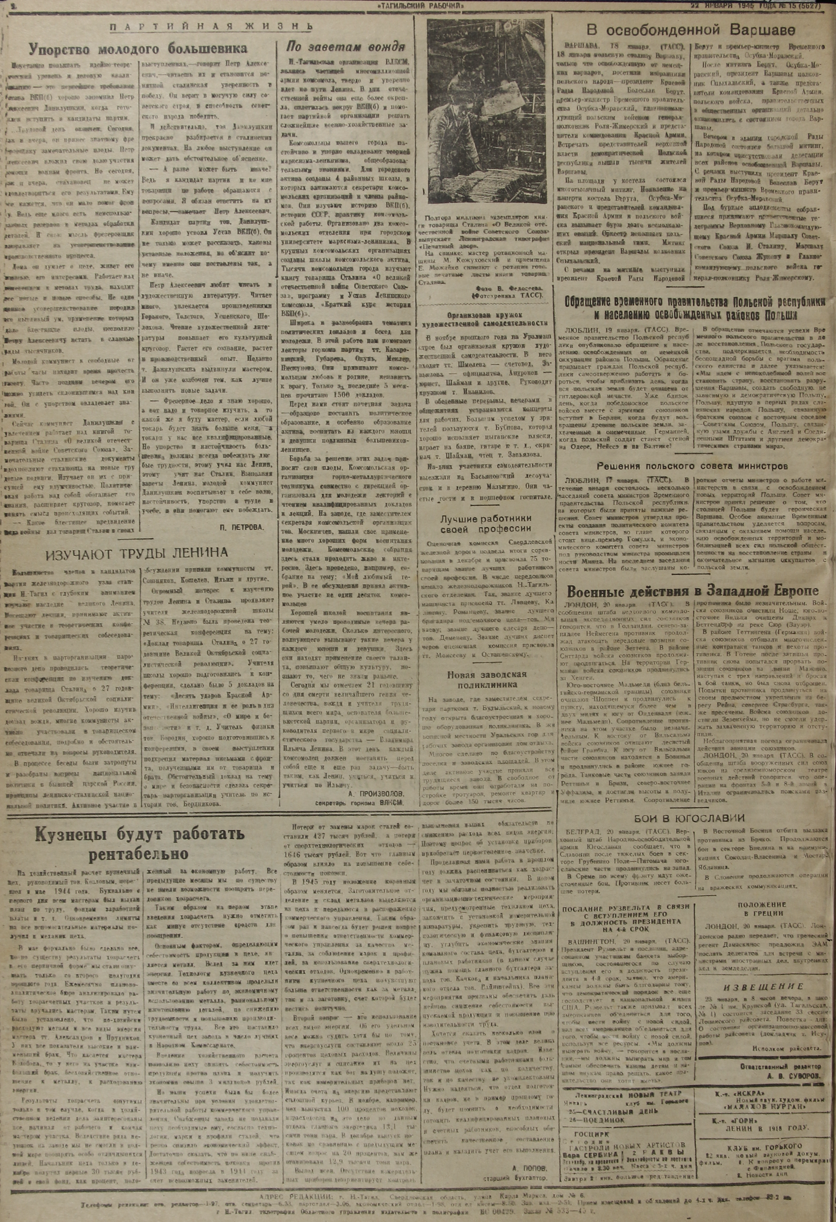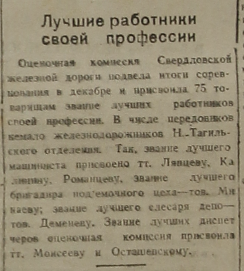 Оценочная комиссия Свердловской железной дороги подвела итоги соревнования в декабре и присвоила 75 товарищам звание лучших работников своей профессии. В числе передовиков немало железнодорожников Н.-Тагильского отделения. Так, звание лучшего машиниста присвоено тт. Ляпцеву, Калинину, Романцеву. звание лучшего бригадира подъемочного цеха – тов. Минаеву; звание лучшего слесаря депо – тов. Деменеву. Звание лучших диспетчеров оценочная комиссия присвоила тт. Моисееву и Осташевскому.