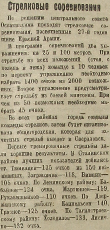 Первые тренировочные стрельбы дали хорошие результаты. В Сталинском районе лучших показателей добились тт. Тюменцев – 135 очков из 150 возможных, Заграничик – 118, Винник – 105 очков. По Ленинскому району: Бабайнов – 124 очка, Мартюшсв – 119, Рукавишников – 110 очков. По Дзержинскому району: Кацнельсон – 140, Грязнов – 125 очков. По Тагилстроевскому району: Холодилов – 133, Лисичко – 132 очка.