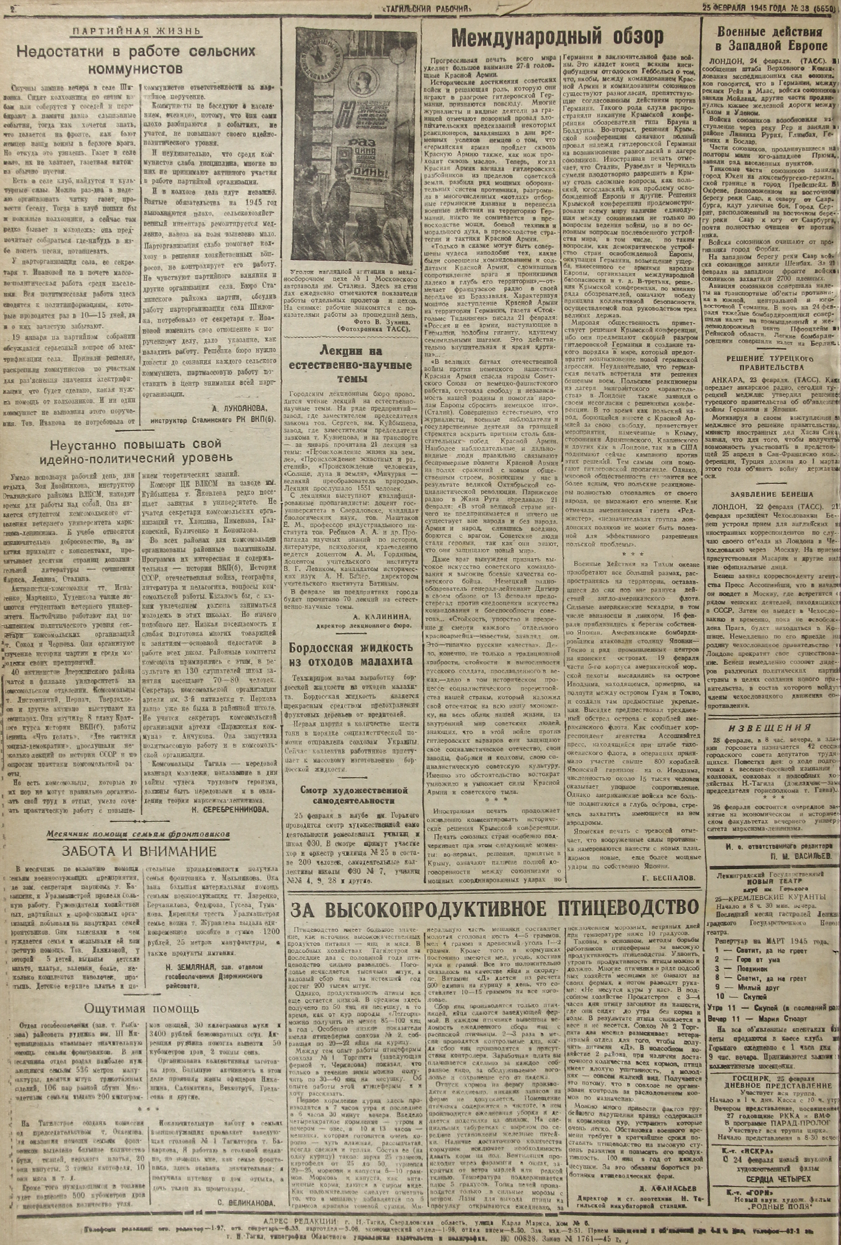 Птицеводство имеет большое значение, как источник высококачественных продуктов питания – яиц и мяса. В подсобных хозяйствах Тагилстроя за последние два с половиной года птицеводство сильно развилось. Поголовье исчисляется тысячами штук, а валовый сбор яиц за истекший год достиг 200 тысяч штук.