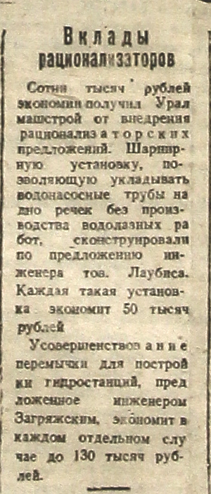 Сотни тысяч рублей экономии получил Уралмашстрой от внедрения рационализаторских предложений. Шарнирную установку, позволяющую укладывать водонасосные трубы на дно речек без производства водолазных работ, сконструировали по предложению инженера тов. Лаубиса. Каждая такая установка экономит 50 тысяч рублей.