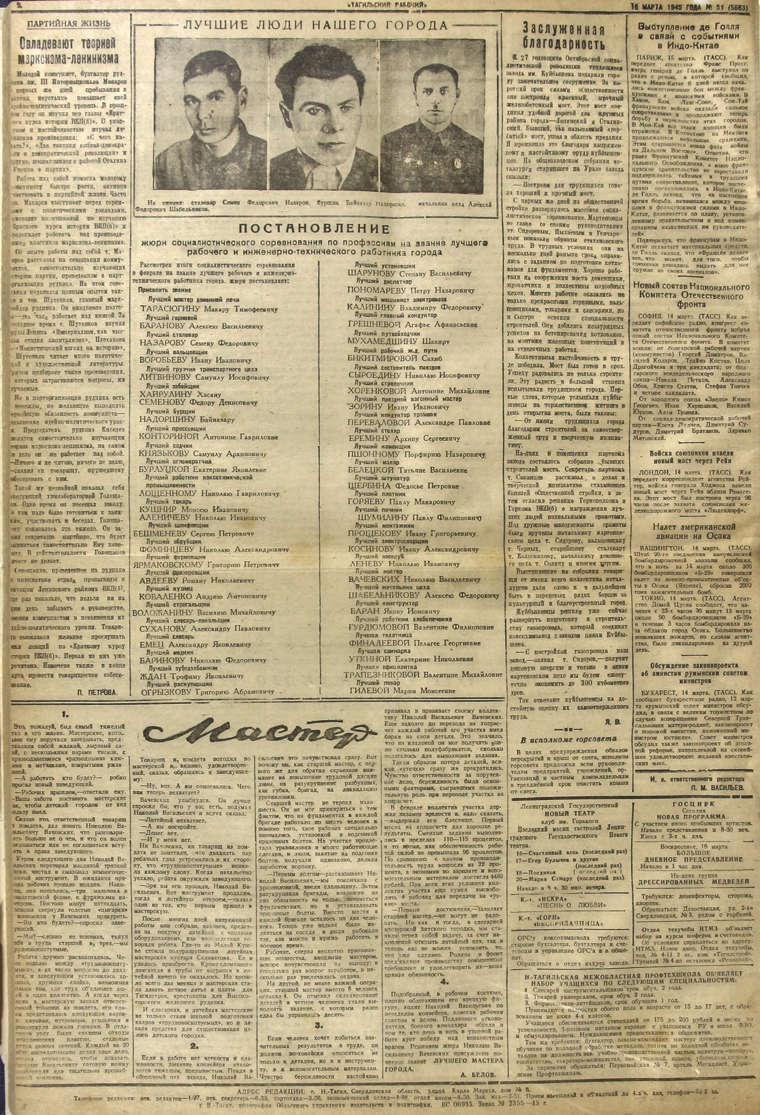 Назаров Семен Федорович, сталевар, Надоршин Байназар, бурщик, Шабельников Алексей Федорович, начальник цеха