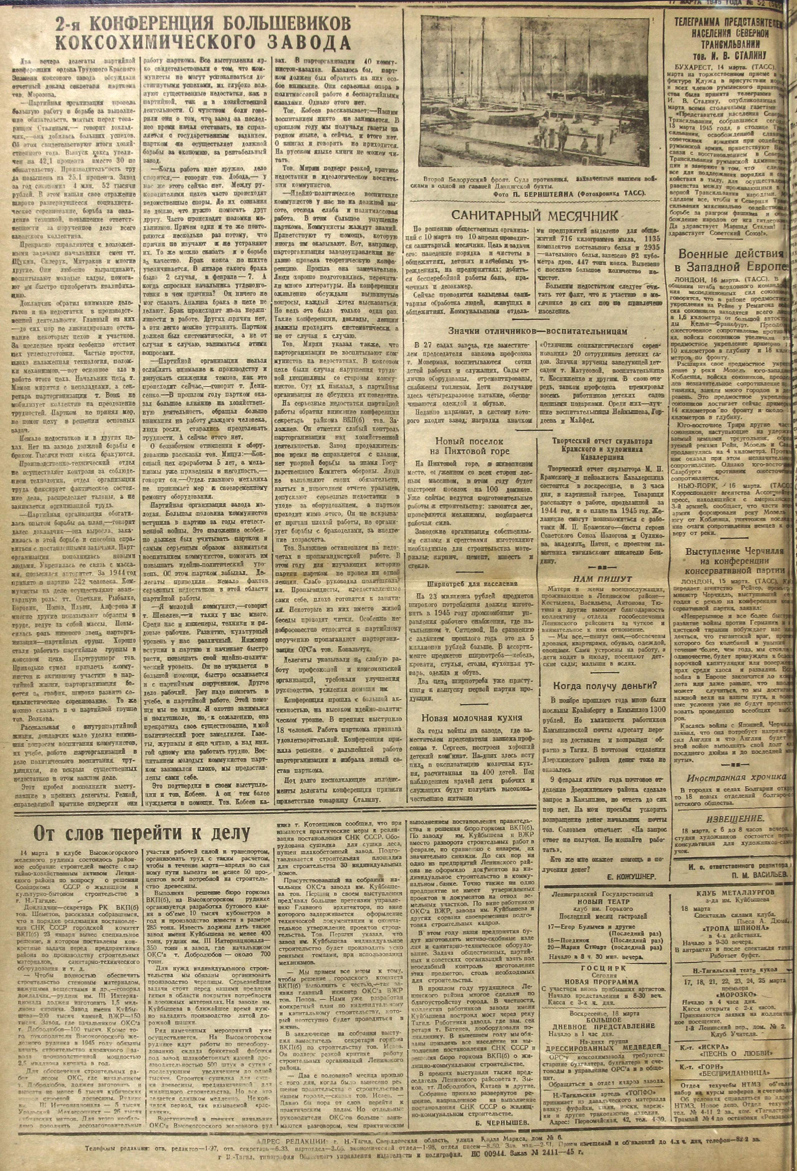 За годы войны на заводе, где заместителем председателя завкома профсоюза т. Сергеев, построен хороший детский комбинат. На-днях здесь вступила в эксплуатацию молочная кухня, рассчитанная на 400 детей. Под наблюдением врачей дети рабочих и служащих будут получать высококачественное питание.