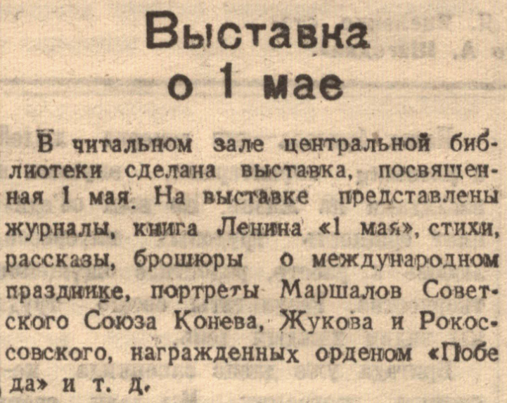 В читальном зале центральной библиотеки сделана выставка, посвященная 1 мая. На выставке представлены журналы, книга Ленина «1 мая», стихи, рассказы, брошюры о международном празднике, портреты Маршалов Советского Союза Конева, Жукова и Рокоссовского, награжденных орденом «Победа» и т. д.
